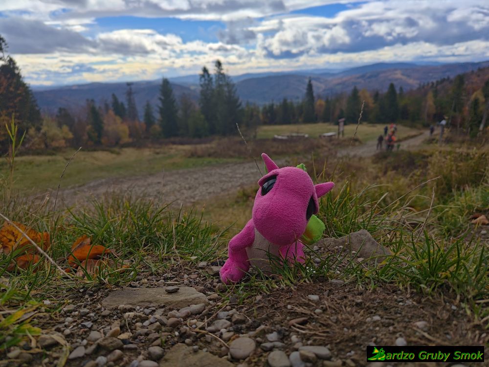 Zaczynamy wycieczkę czerwonym szlakiem. Na pierwszym rozwidleniu dróg trzeba wejść w las porzucając asfalt. Droga pnie się pod górę i warto co jakiś czas oglądnąć się za siebie, żeby podziwiać kolorowe góry i pagórki widoczne z tej perspektywy.