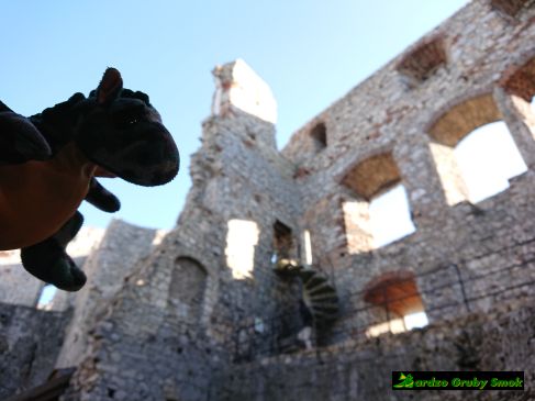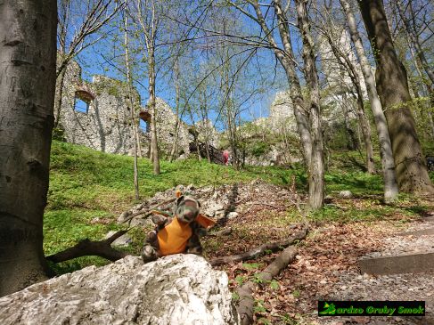 Decydujemy, że nie mamy czasu na zwiedzanie go, więc tylko obchodzimy go dookoła ścieżką dydaktyczną z tablicami dotyczącymi historii zamku i okolicznej przyrody. Dzięki temu dowiadujemy się, że w skale będącej murem zamku znajduje się wizerunek Matki Boskiej.