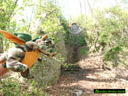Tę drogę też już znamy – kiedyś jej fragment pokonywaliśmy pieszo przy okazji spaceru po Dolinie Eliaszówki. Jadąc powoli na tym stromym odcinku warto patrzeć na prawo między drzewami – znajdują się tam kolejno ruiny furty klasztornej, ruiny Diabelskiego Mostu i (już za klasztorem) źródełko proroka Eliasza.
