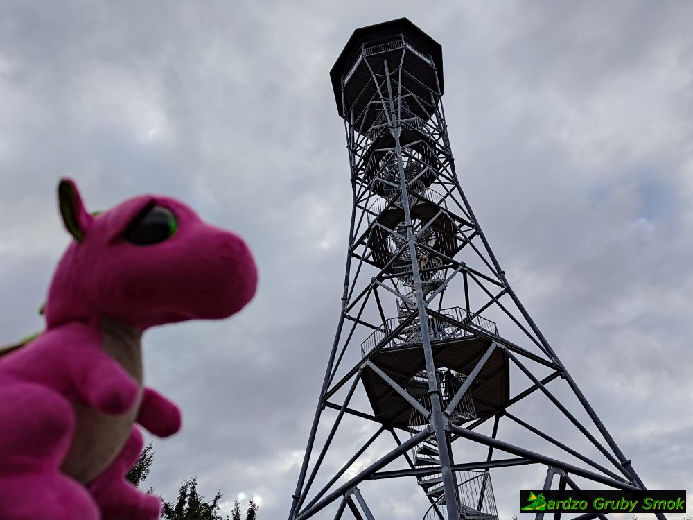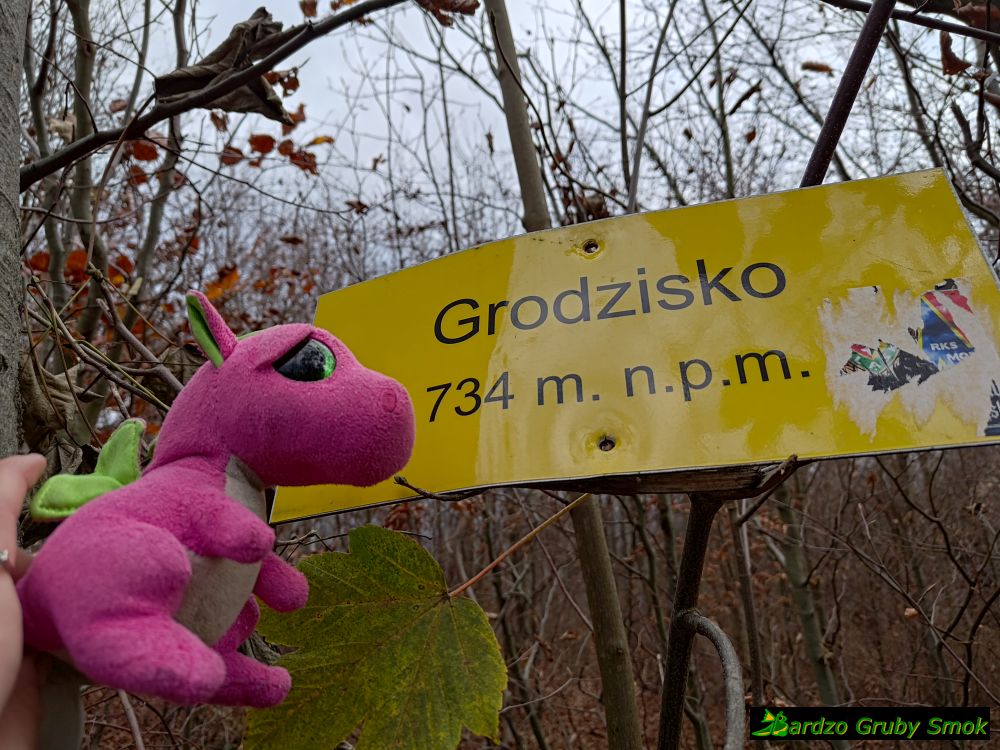 Następnie pojawia się wypłaszczenie. Przechodzimy przez skrzyżowanie z większą leśną drogą delikatnie pod górę. Nie rozpędzamy się jednak, tylko uważnie patrzymy na oznaczenia szlaku. Co prawda tabliczka informująca o kierunku na wieżę widokową pokazuje, żeby iść dalej tą niemal płaską, szeroką drogą. Jednak szlak skręca niespodziewanie w las i na pierwszym odcinku jest dość stromy. Wdrapujemy się na Grodzisko.
