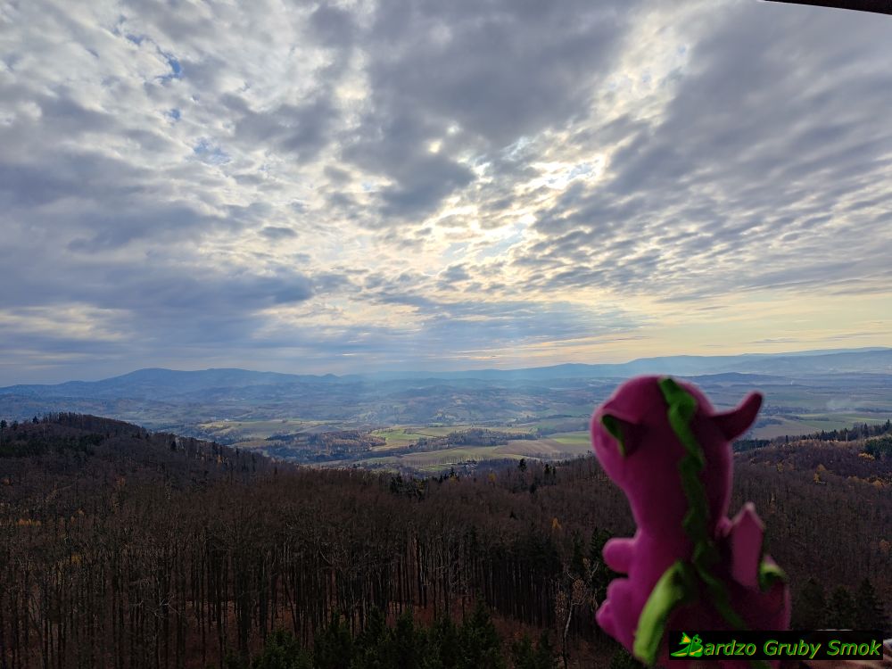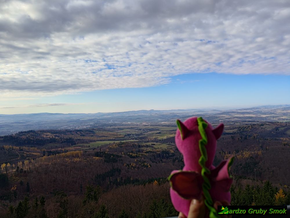Roztacza się stąd przepiękny widok na wszystkie strony świata. Idealnie widać całą Kotlinę Kłodzką otoczoną Masywem Śnieżnika, Górami Złotymi, Bialskimi, Bystrzyckimi, Orlickimi i Stołowymi. W kierunku północno-wschodnim z kolei widać zbiorniki wodne przy Paczkowie i Otmuchowie i Dolinę Nysy Kłodzkiej. Jest co oglądać! I co ważne, na wieży w każdą stronę świata jest postawione zdjęcie panoramy z podpisanymi widocznymi szczytami. Widoki są świetne. Warto było tu wejść!