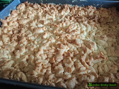 Na tak przygotowane ciasto (przed upieczeniem) nałożyć owoce. Z białek, które zostaną po zarobieniu ciasta kruchego, można ubić piankę z odrobiną cukru pudru i delikatnie rozsmarować na wierzchu na owocach.